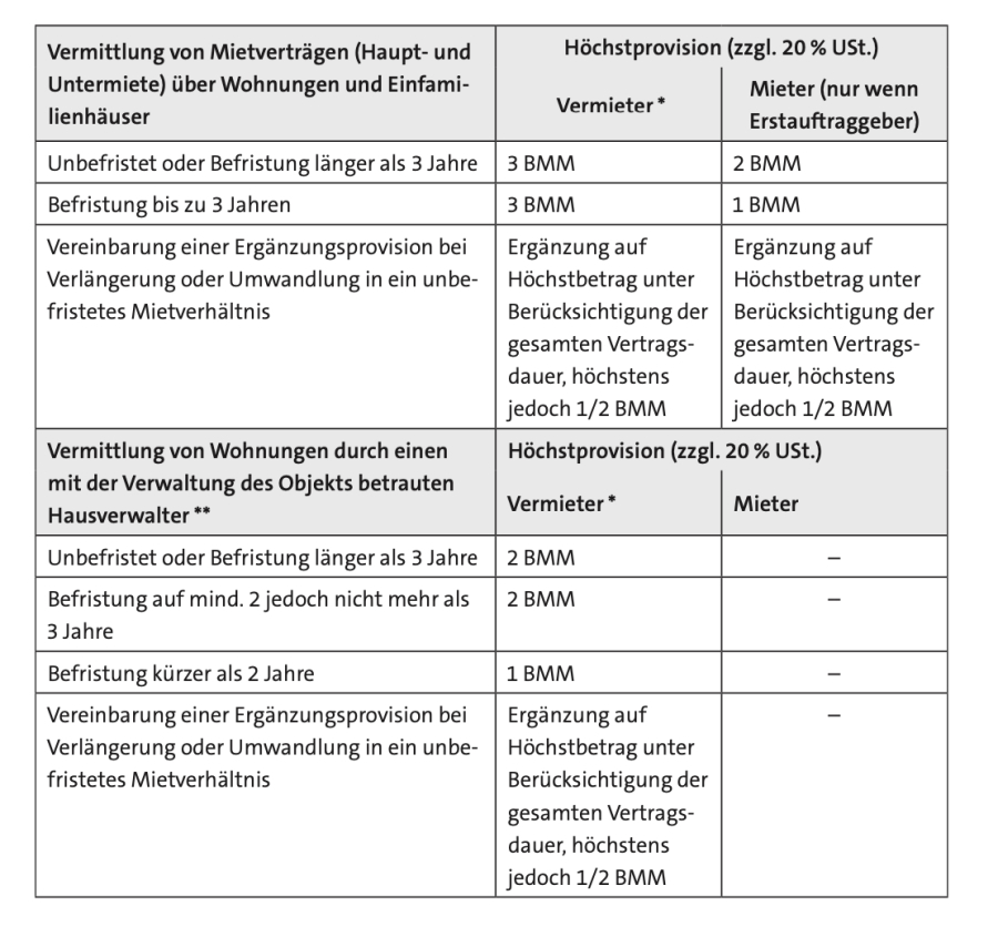 Für die Berechnung der Provisionsgrundlage ist die Umsatzsteuer nicht in den Bruttomietzins einzurechnen. Die Heizkosten sind ebenso wenig mit einzurechnen, wenn es sich um die Vermittlung von Mietverhältnissen an einer Wohnung handelt, bei der nach den mietrechtlichen Vorschriften die Höhe des Mietzinses nicht frei vereinbart werden darf (angemessener Mietzins, Richtwertmietzins).